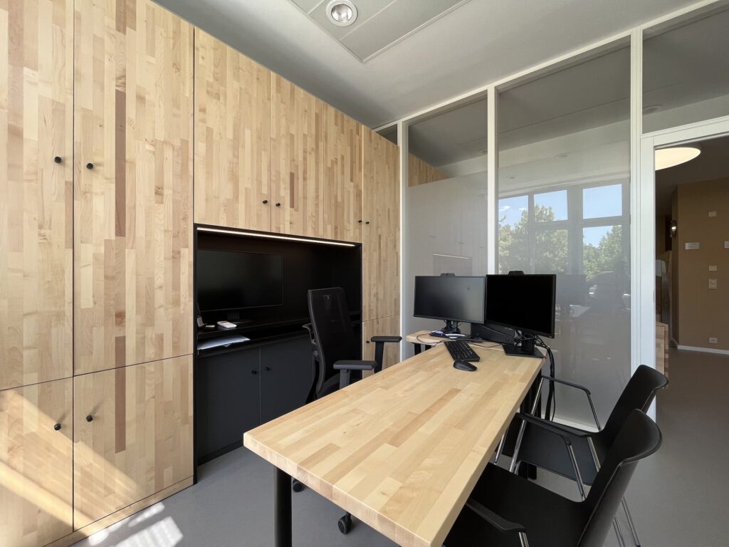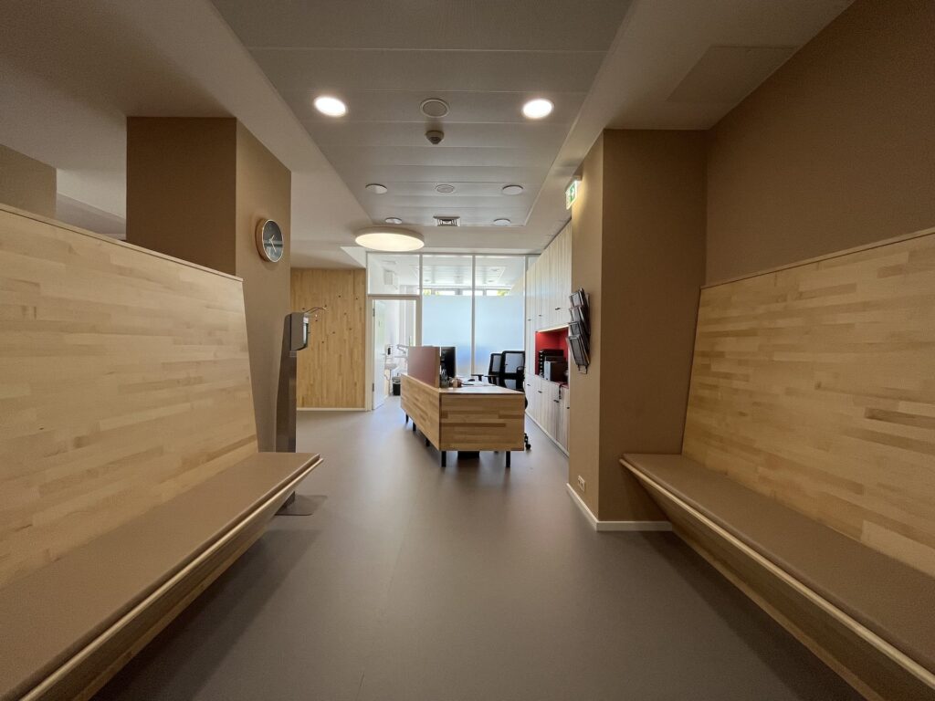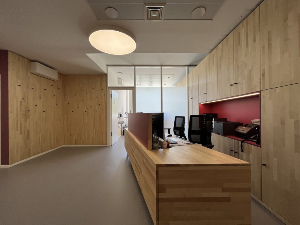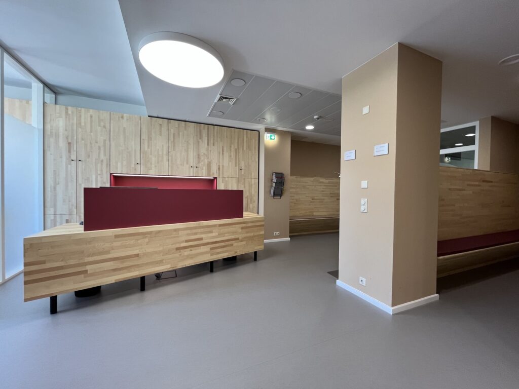 #Arztpraxis #Praxissanierung #Nuklearmedizinische Praxis #Carl-von-Basedow-Klinikum #Strahlenschutz #Möbel #Massivholz #Bioboden #Pflanzenöl Fußboden robust #Ahorn keilgezinkt geölt #Kautschuk #Tischlerarbeit #Farbkonzept #Beleuchtungskonzept #Counter #Bildschirmarbeitsplätze #Rezeption #Empfang #HOAI LPH 1, 2, 3, 5, 7, 8